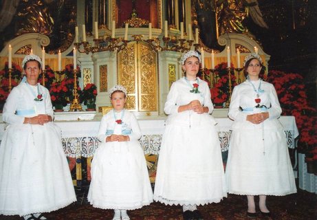Am Sonntag, dem 8. Juli, zogen kurz nach 09.00 Uhr die zahlreichen Pilger und Trachtengruppen aus mehreren Ländern, darunter auch die Muttergottesmädchen und bunte Trachten der Franztaler Ortsgemeinschaft mit Kirchenfahnen und der großen Muttergottesstatue in die St. Anna Basilika ein.