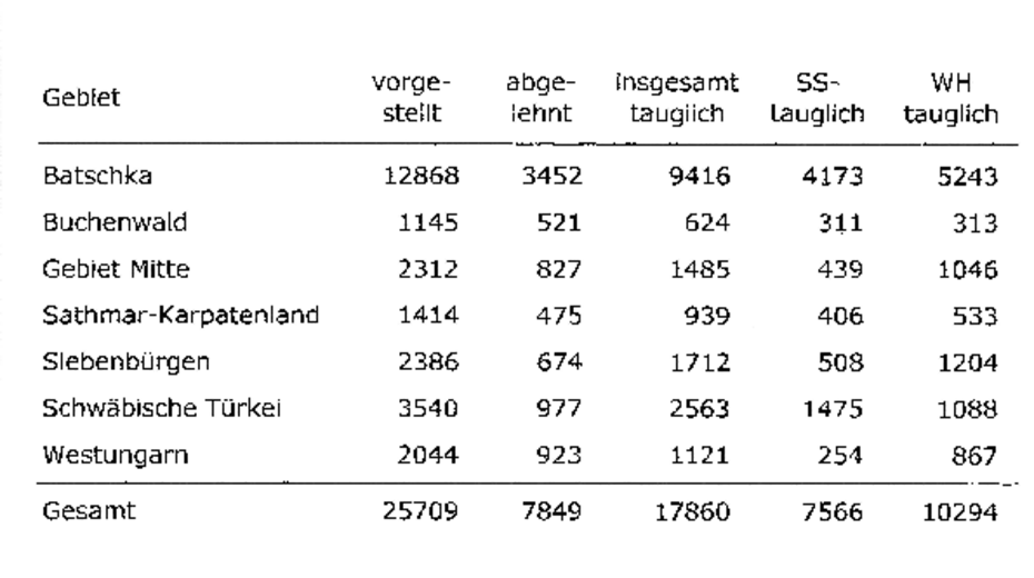 Der Batschka kam im gesamten ungarndeutschen Wehrpotential der höchste Stellenwert zu. Das erhellt schon aus dem Ergebnis der am 3. April 1942 abgeschlossenen Musterung der ersten Werbeaktion12.