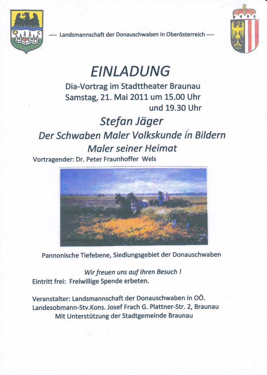 Mit einer liebevoll zusammengestellten und „trockenem“ Humor präsentierten Bildauswahl konnte der Vortragende zweimal (am Nachmittag und am Abend) das Publikum im Stadttheater beeindrucken. Wie kein zweiter Banater Maler hat Stefan Jäger (*1877 Österreich-Ungarn, âEUR 1962 Rumänien) es verstanden, die untergegangene Welt seiner donauschwäbischen Landsleute einzufangen. Der Künstler hat unzählige Gemälde, Skizzen und Studien in den verschiedensten Techniken geschaffen, welche er meist vor Ort mit Pinsel, Feder und Zeichenstift detailgetreu festgehalten hat. Nun sind seine zahlreichen Bilder weltweit verstreut und werden von den jeweiligen Besitzern wie ein Schatz gehütet.
