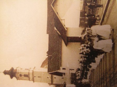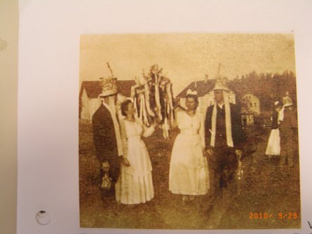 Die Kerweih-Paare in schmucker Tracht mit der Tanzmusi vor dem Kirchgang im Hinterhof der „Bösbauer– Villa“.