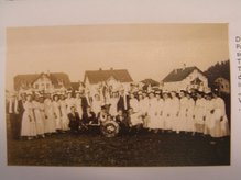 Auf dem Bild : die Trachtenbraut Leni Jost (Pill) aus Sigmundfeld und der Bräutigam Hans Holz, Ernsthausen, inmitten der Hochzeitsgäste in donauschwäbischer Tracht.