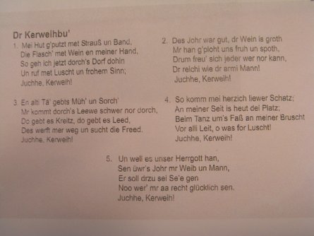 Die Jugend wurde in der Folge informiert und eingeladen, das Fest heimatbezogen mit zu gestalten. Die Formalitäten und die inhaltliche Gestaltung der „Kerweih“ – kurz genannt – wurden besprochen und die Vorbereitungen für den zweiten Sonntag im November terminisiert. Das Rahmenprogramm wurde zur Kenntnis genommen, und zwar der Kirchgang in heimatlicher Festtracht, die Messe, die Weihe des Kerweih-Straußes, sodann der geschlossene Zug zum „Kerweihplatz“ im Hof der „Villa“. Besonders wichtig, schon Wochen zuvor, war für die Burschen, dem ausgewählten Mädl den Hut zum „Putzen“ zu überbringen. Die Mädchen erfüllten mit Freude diese Liebesbezeugung.