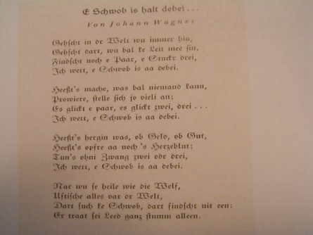 Der 1.Geldherr stieg auf den geschmückten Tisch und begrüßte die Kerweih-Paare und die zahlreichen Landsleute und dankte allen, die ihren Beitrag zu diesem heimatbezogenen Fest in der „Fremde“ geleistet haben. Sodann trug er das Gedicht „Dr Kerweihbu'“ von Josef Gabriel d. Ä. in unserer Mundart gekonnt vor: